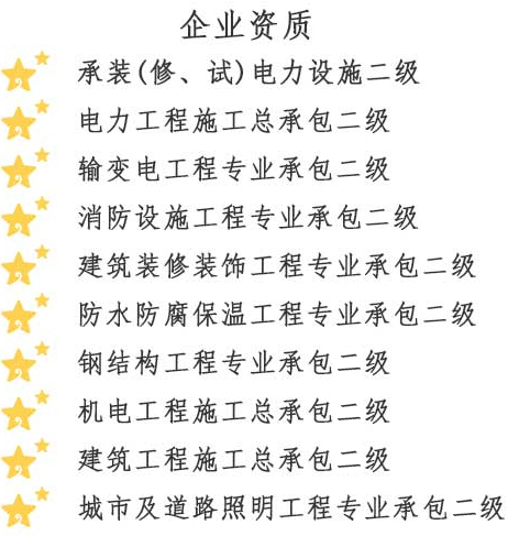 金楓電力集團有限公司,成立于2015年5月28日,注冊資金6060萬元,是一家專業從事電力工程施工的集團化公司。公司經營范圍包括:電氣安裝服務;建設工程施工;輸電、供電、受電電力設施的安裝、維修和試驗;測繪服務;建筑勞務分包;建筑工程設計;發電機及發電機組制造;建筑工程機械與設備租賃;工業工程設計服務;技術服務、技術開發、技術咨詢、技術交流、技術轉讓、技術推廣等。公司持有國家能源局頒發的承裝(修、試)電力設施許可證,承裝類二級、承修類二級、承試類二級資質;電力工程施工總承包二級資質;輸變電工程專業承包二級資質;建筑裝修裝飾工程專業承包二級資質;消防設施工程專業承包二級資質;防水防腐保溫工程專業承包二級資質;施工勞務資質;機電工程施工總承包二級;建筑工程施工總承包二級;城市及道路照明工程專業承包二級;鋼結構工程專業承包二級資質;公司已通過質量管理體系認證、環境管理體系認證及職業健康安全管理體系認證。并獲得省級信用評價AAA證書;連續多年納稅信用評價A級。